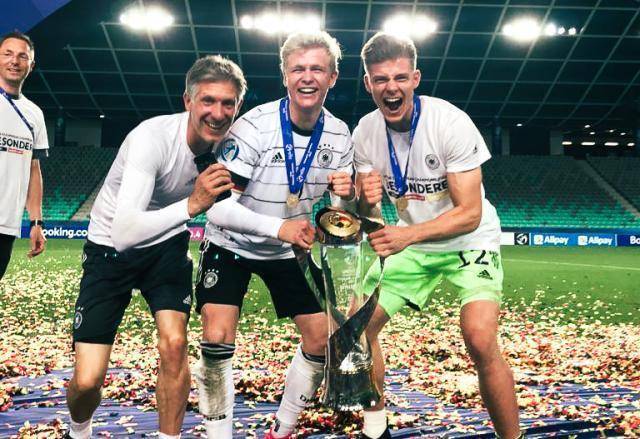 2021年U21欧青赛,两位美因茨球员达门和布尔卡特拿着冠军奖杯留影。